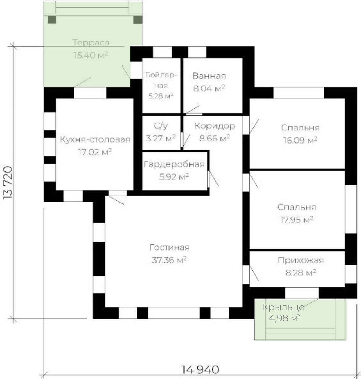 Одноэтажный дом. Площадь дома 128 м2. Дополнительный пакет 20,4 м2 площадь террасы и крыльца.