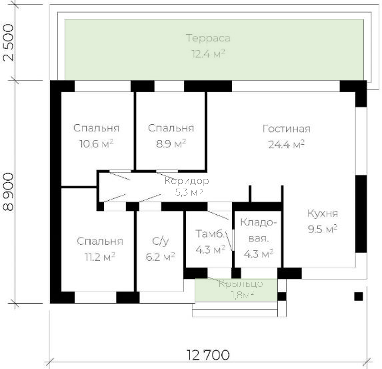 Одноэтажный дом. Площадь дома 85 м2. Дополнительный пакет: 14,2 м2 площадь террасы и крыльца.