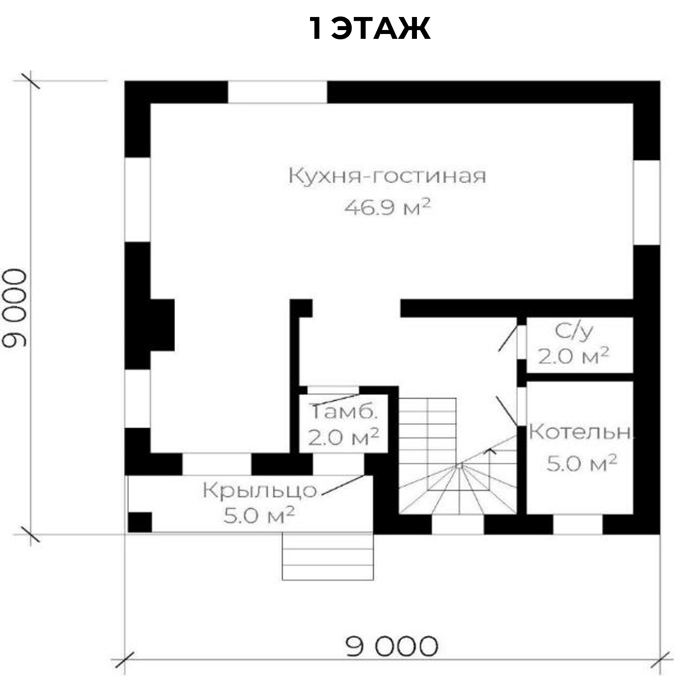Первый этаж 60 м2: кухня-гостиная, с/у, котельная